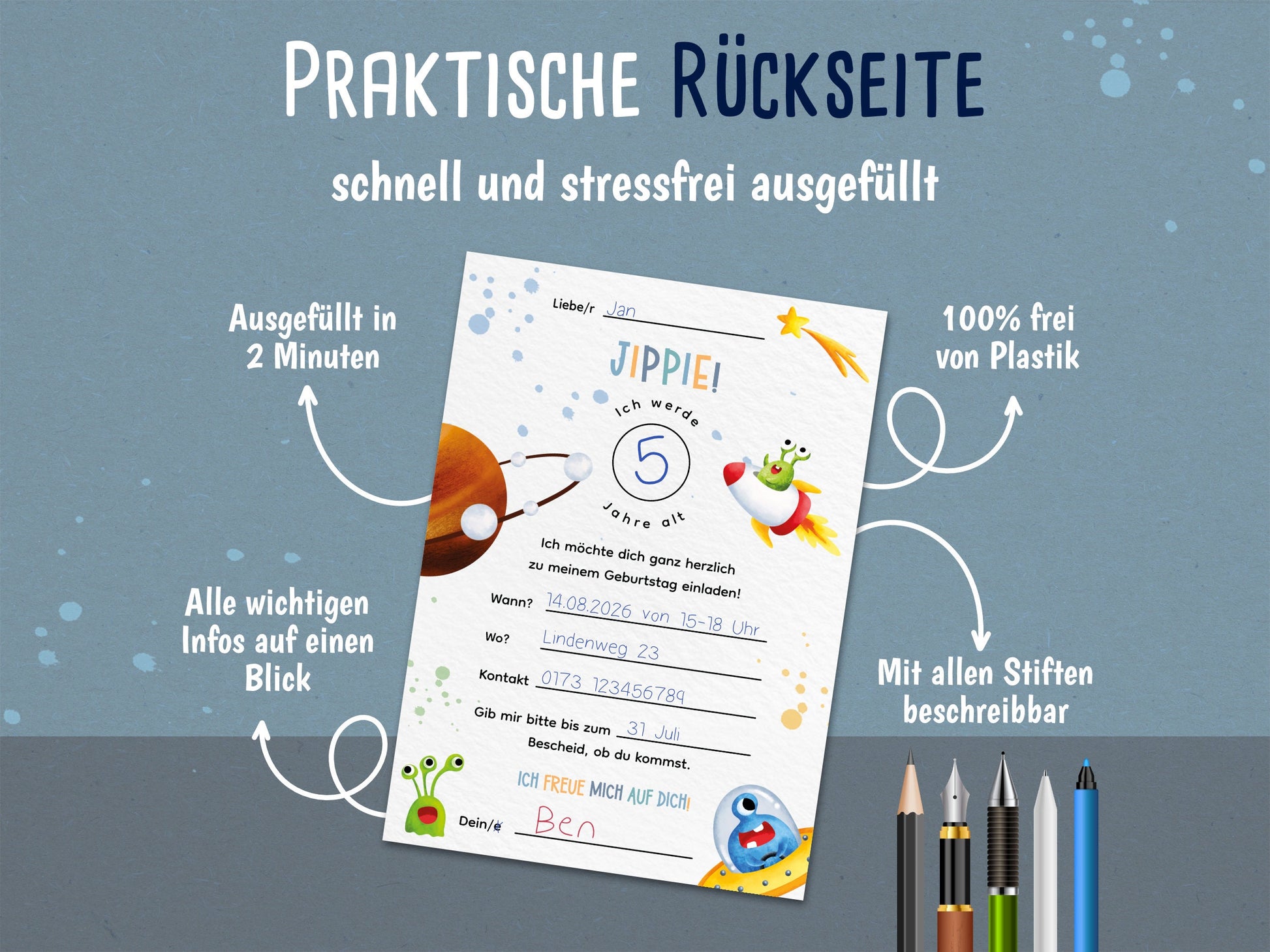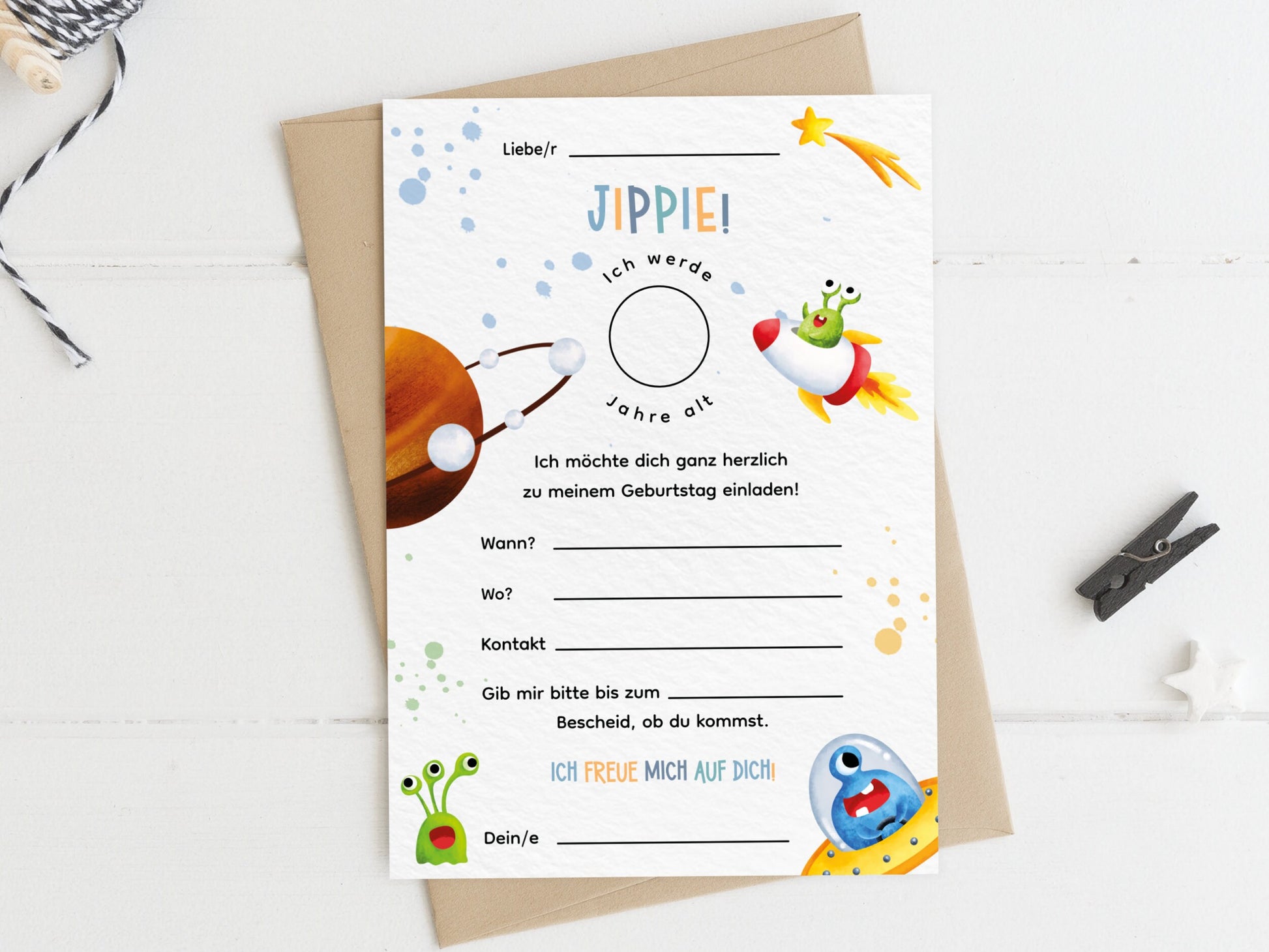 Die Einladung ist beidseitig bedruckt und innen unbeschriftet, sodass du den Text ganz individuell gestalten kannst. So bekommt jede Feier eine persönliche Note – egal ob für den 4. Geburtstag, die erste große Weltraum-Mission oder eine abenteuerliche Themenparty.