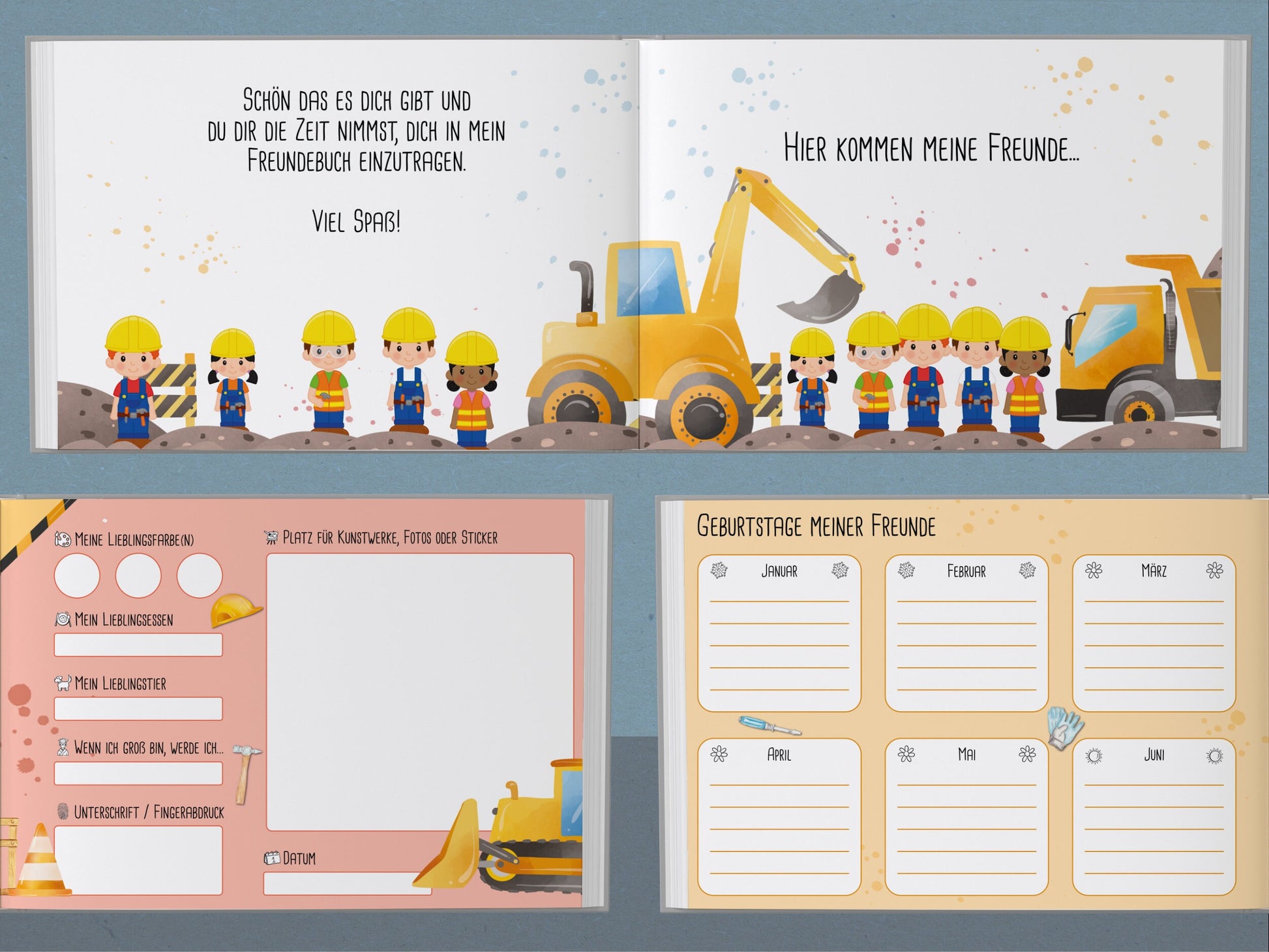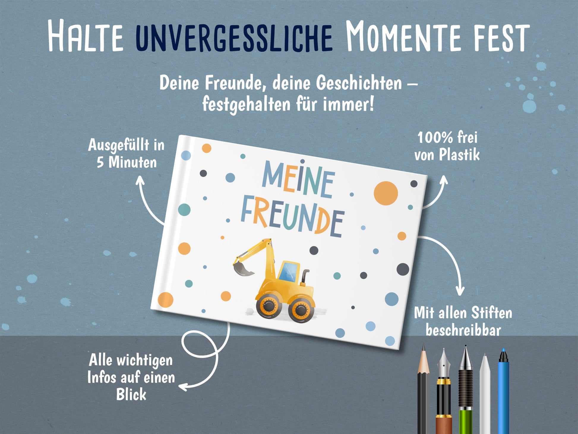 Dieses liebevoll gestaltete Freundebuch im Din A5 Querformat ist der perfekte Begleiter für kleine Bau- und Baggerfans im Kindergarten oder der Grundschule. Mit Platz für 28 Freunde bietet es Raum für kreative Einträge, lustige Hobbys, kleine Geheimnisse – und natürlich eine Zeichnung vom Lieblingsbagger.