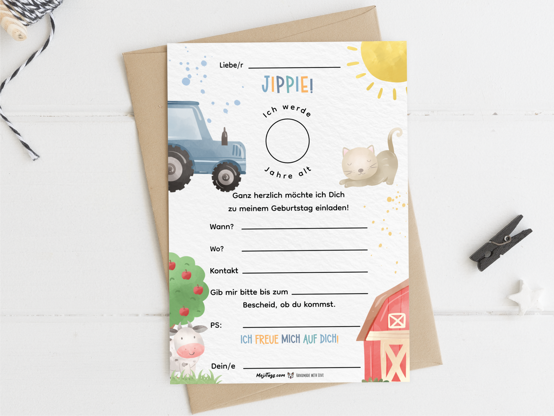 Mähhh macht die Vorfreude! Mit dieser liebevoll gestalteten Bauernhof-Einladung beginnt das Geburtstagsabenteuer schon beim Verteilen. Ob Schweinchen, Traktor oder Hühner: Die fröhlichen Motive zaubern kleinen Gästen ein Lächeln ins Gesicht – und Lust auf Party!