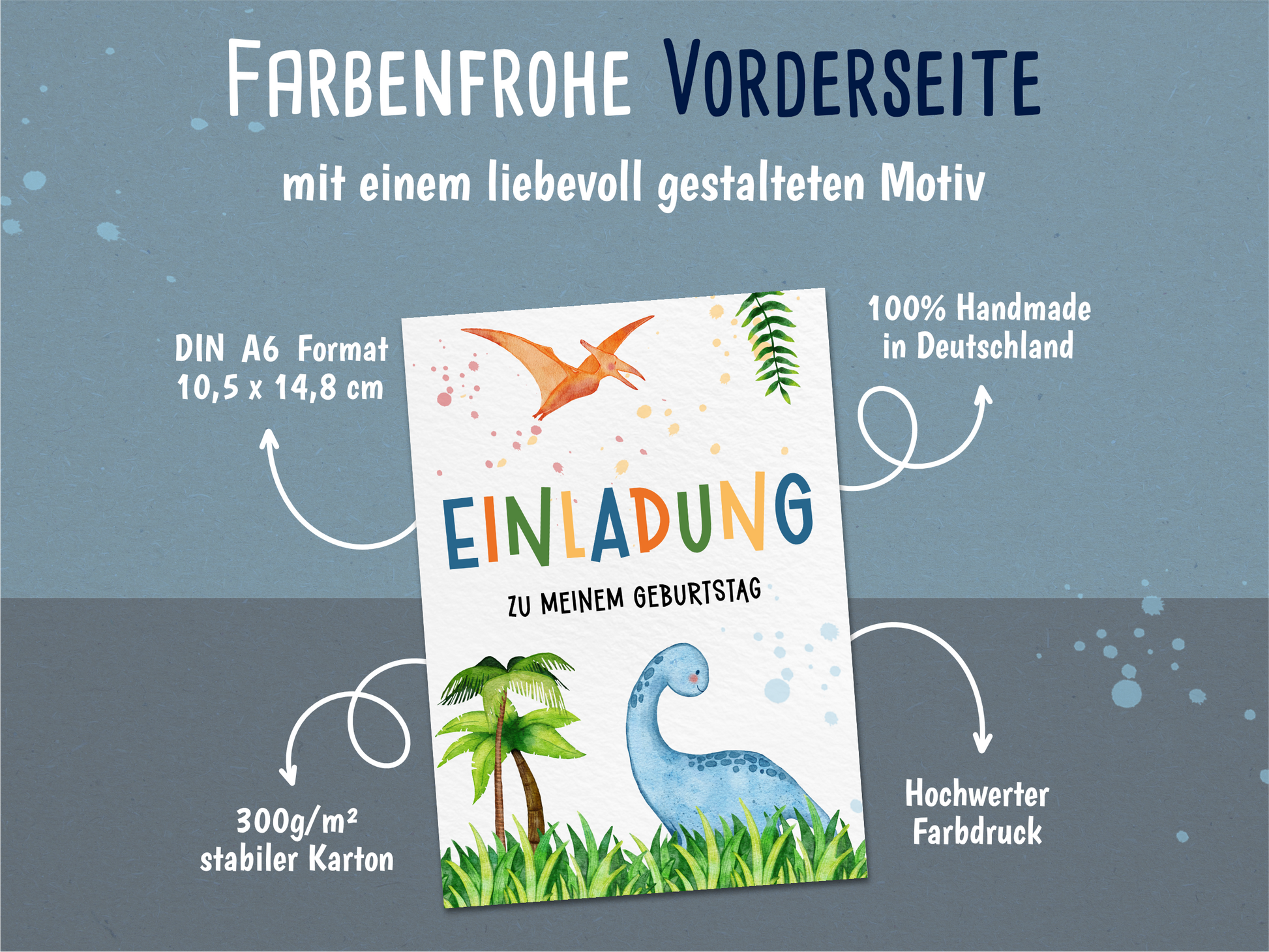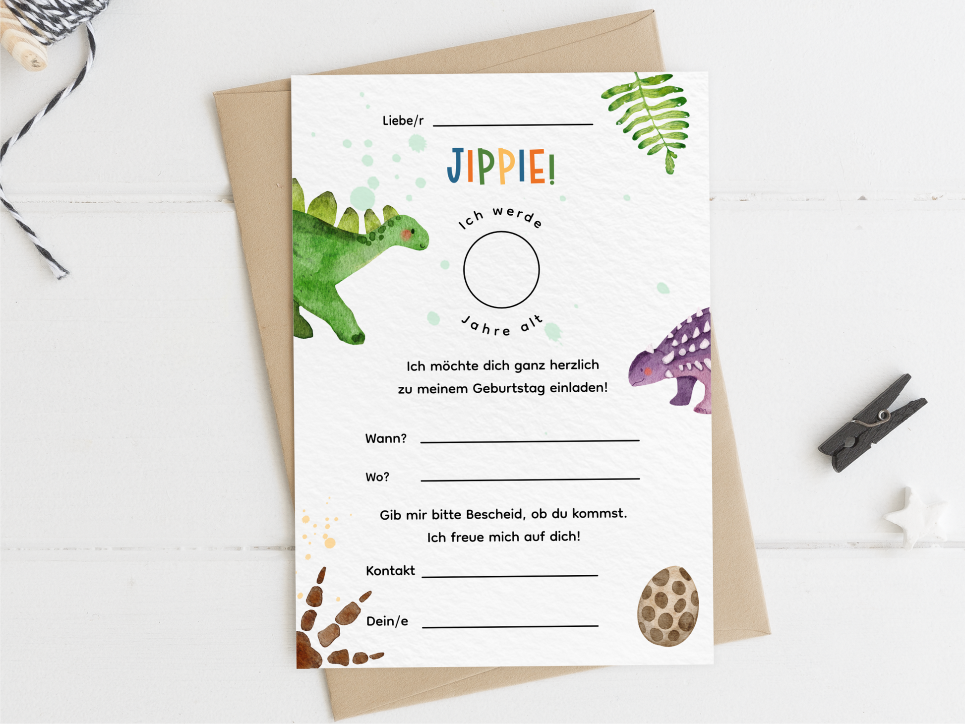 Die bunten Dino-Motive im Aquarellstil lassen Kinderherzen höher schlagen und sorgen garantiert für Vorfreude auf die Party. Die Rückseite ist übersichtlich gestaltet und lässt sich mit jedem Stift beschriften.