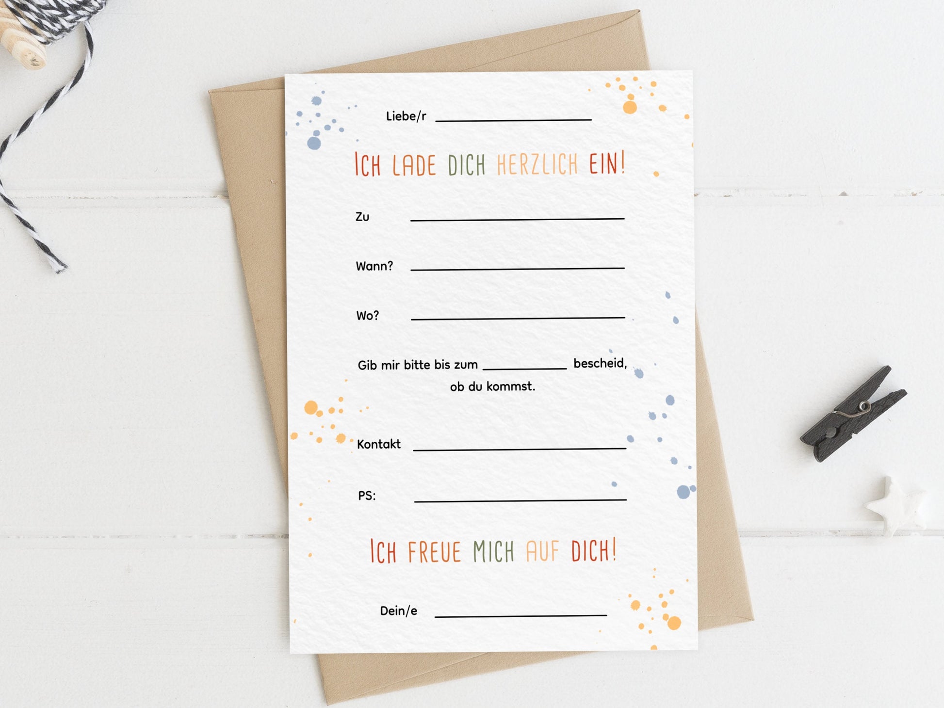 Dank des praktischen DIN A6 Formats passen die Karten problemlos in jeden Briefumschlag und bieten auf Vorder- und Rückseite genug Platz für alle wichtigen Infos: Wann steigt die Party, wo wird gefeiert und um wie viel Uhr geht’s los? Du trägst es ein – und die Vorfreude beginnt!