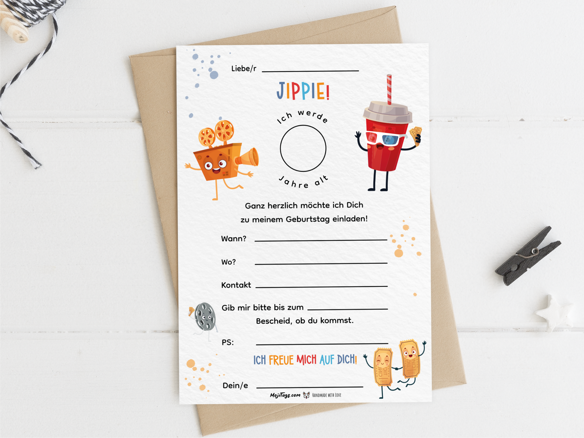 Mit unserer liebevoll handgefertigten Kino Einladungskarte beginnt das Geburtstagsabenteuer schon beim Einladen. Perfekt für kleine Filmfans, die ihren Ehrentag wie einen echten Blockbuster feiern möchten!