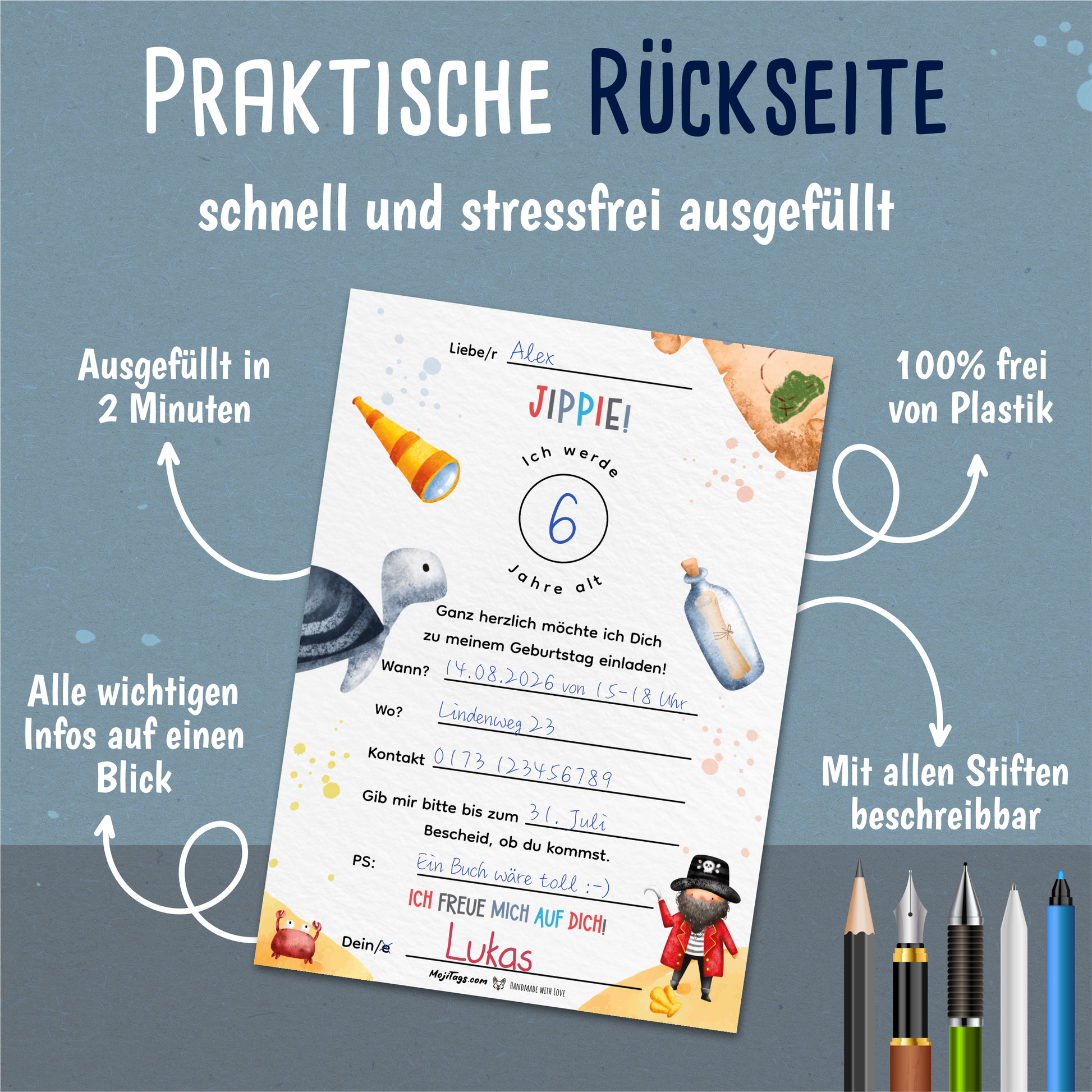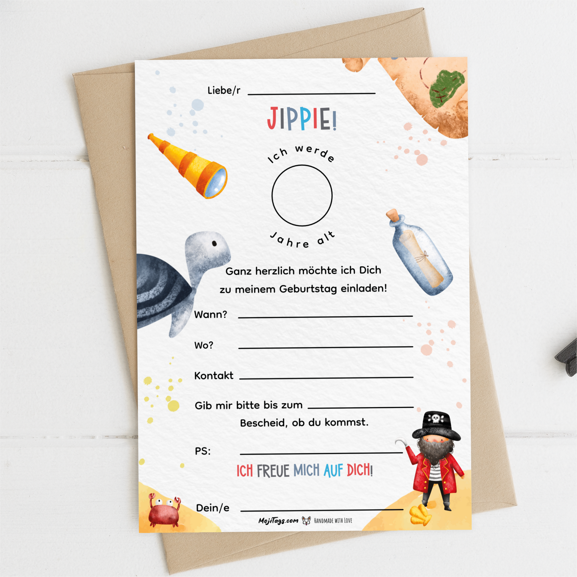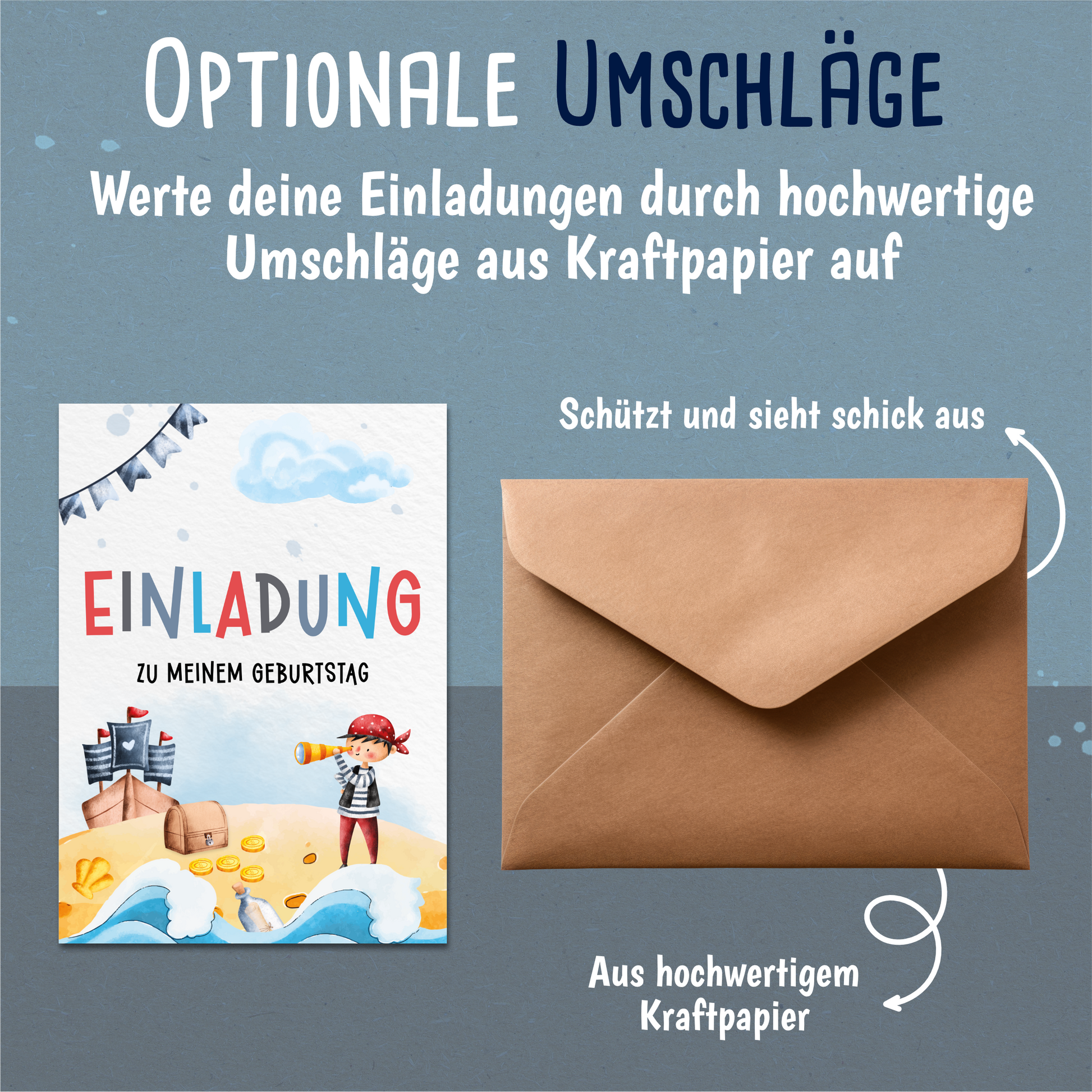 - Mit oder ohne Umschlag: Wähle optional, ob du passende Umschläge aus schönem Kraftpapier dazu möchtest – das passt perfekt zum rustikalen Piraten-Look.