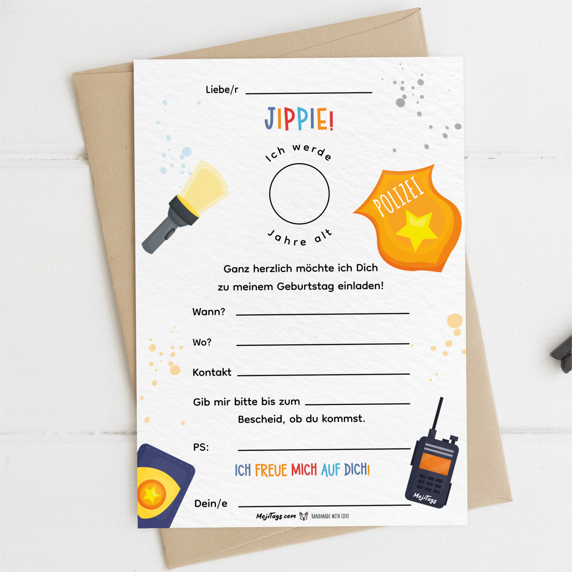 Der nächste Einsatz steht bevor: Ein legendärer Kindergeburtstag! Mit diesen coolen Polizei-Einladungskarten informierst du das Einsatzteam (die Gäste) stilsicher über Ort und Zeit der Feier.
