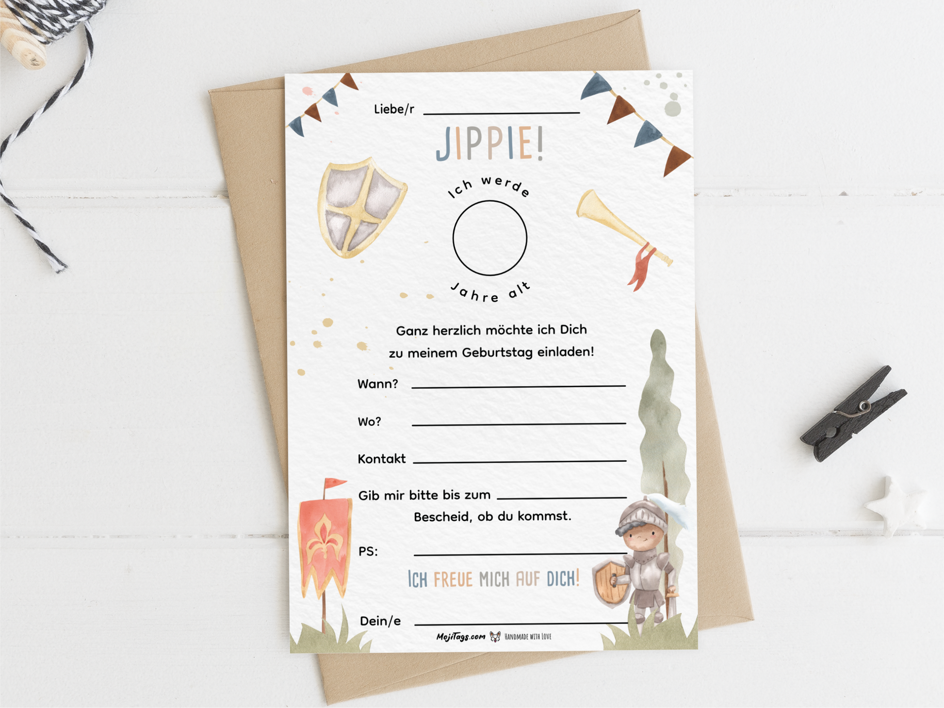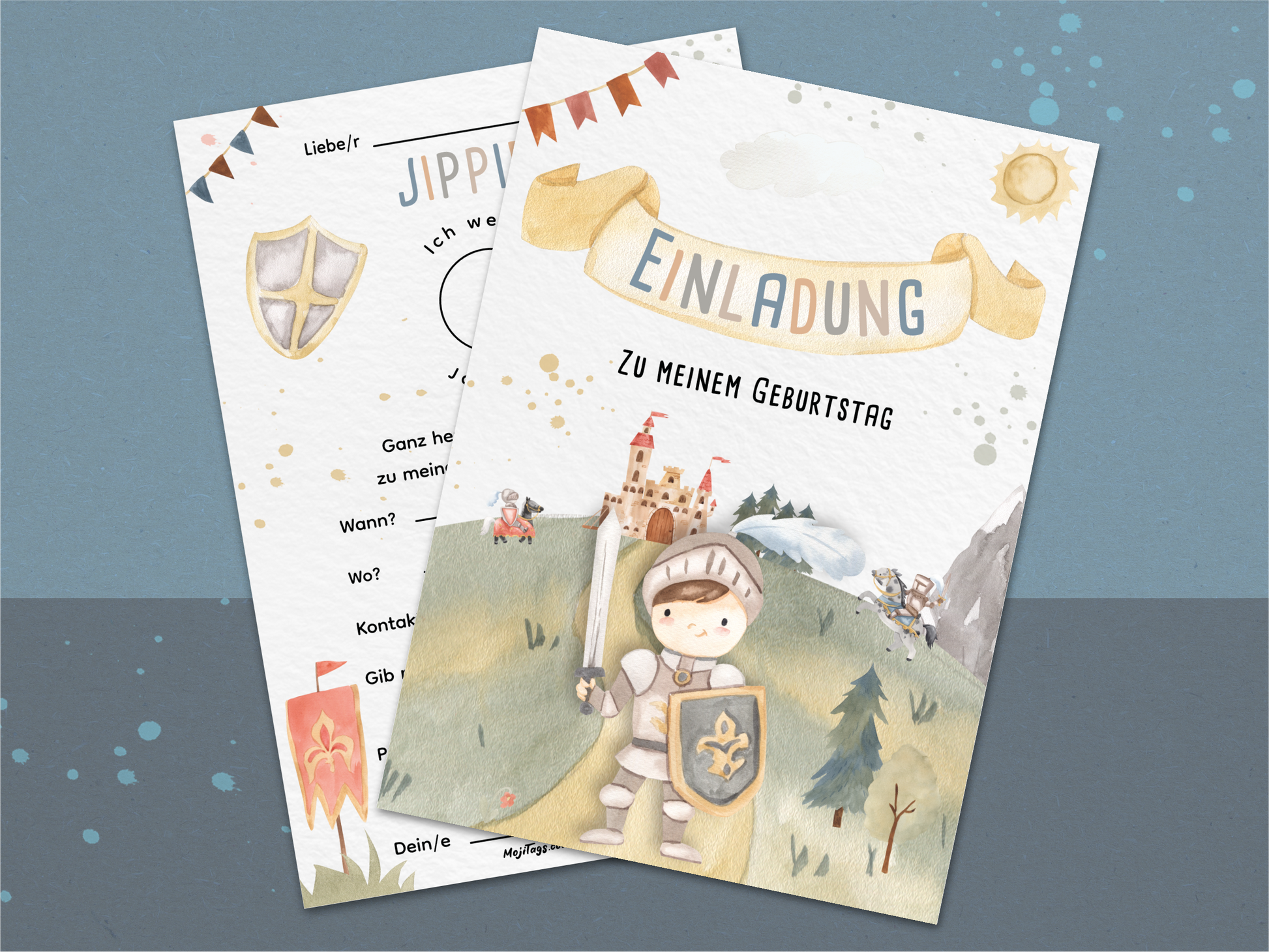 Tauche ein in die Welt der Ritter, Burgen und Abenteuer! Mit unseren handgemachten Ritter Einladungskartenwird die Geburtstagsfeier deines Kindes schon bei der Einladung zu einem Highlight.