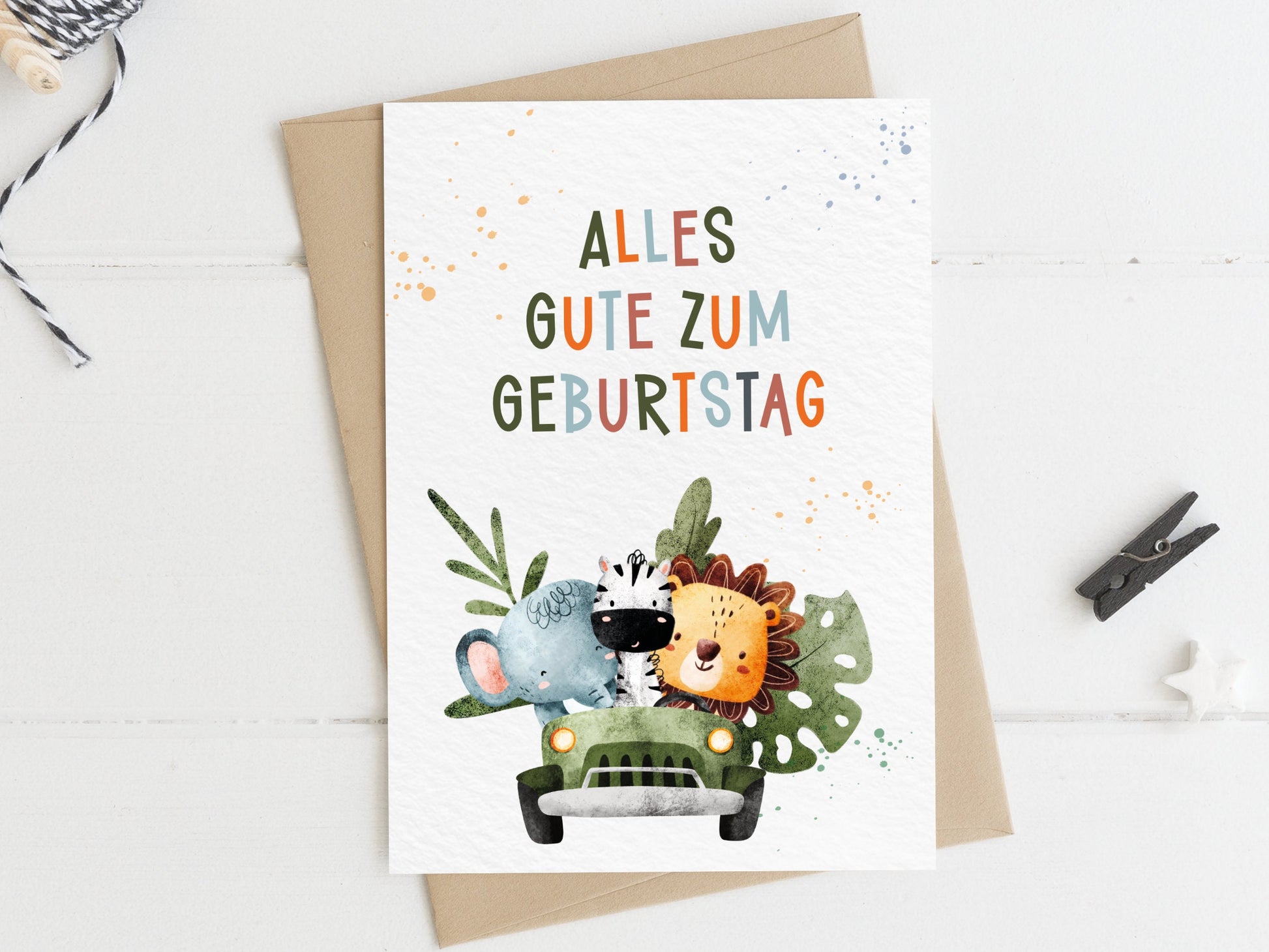 Bring wilden Dschungelspaß auf den Geburtstagstisch! Unsere liebevoll illustrierte Grußkarte im Safari-Look lässt Kinderherzen höherschlagen und zaubert auch den Erwachsenen ein Lächeln ins Gesicht.
