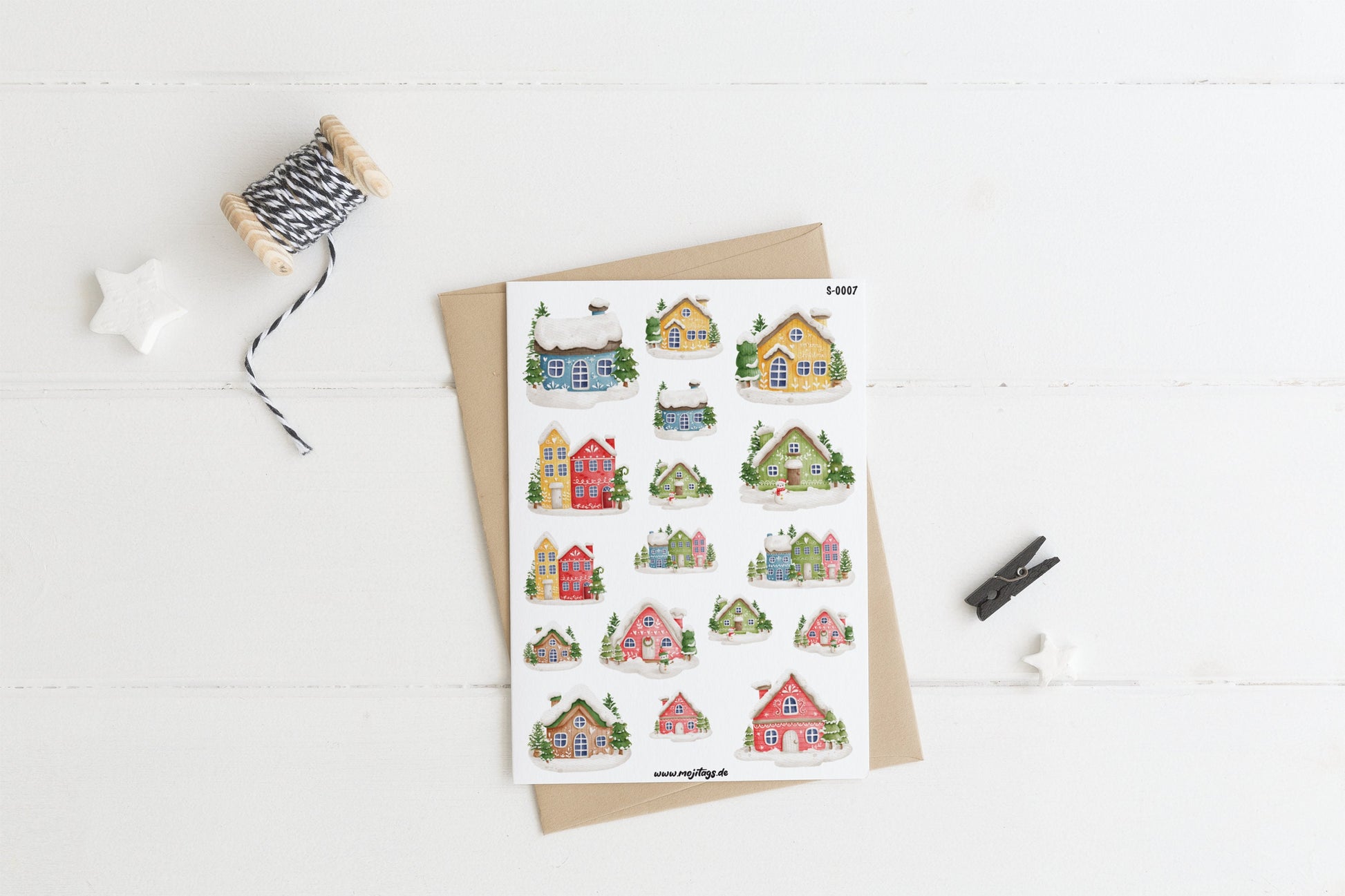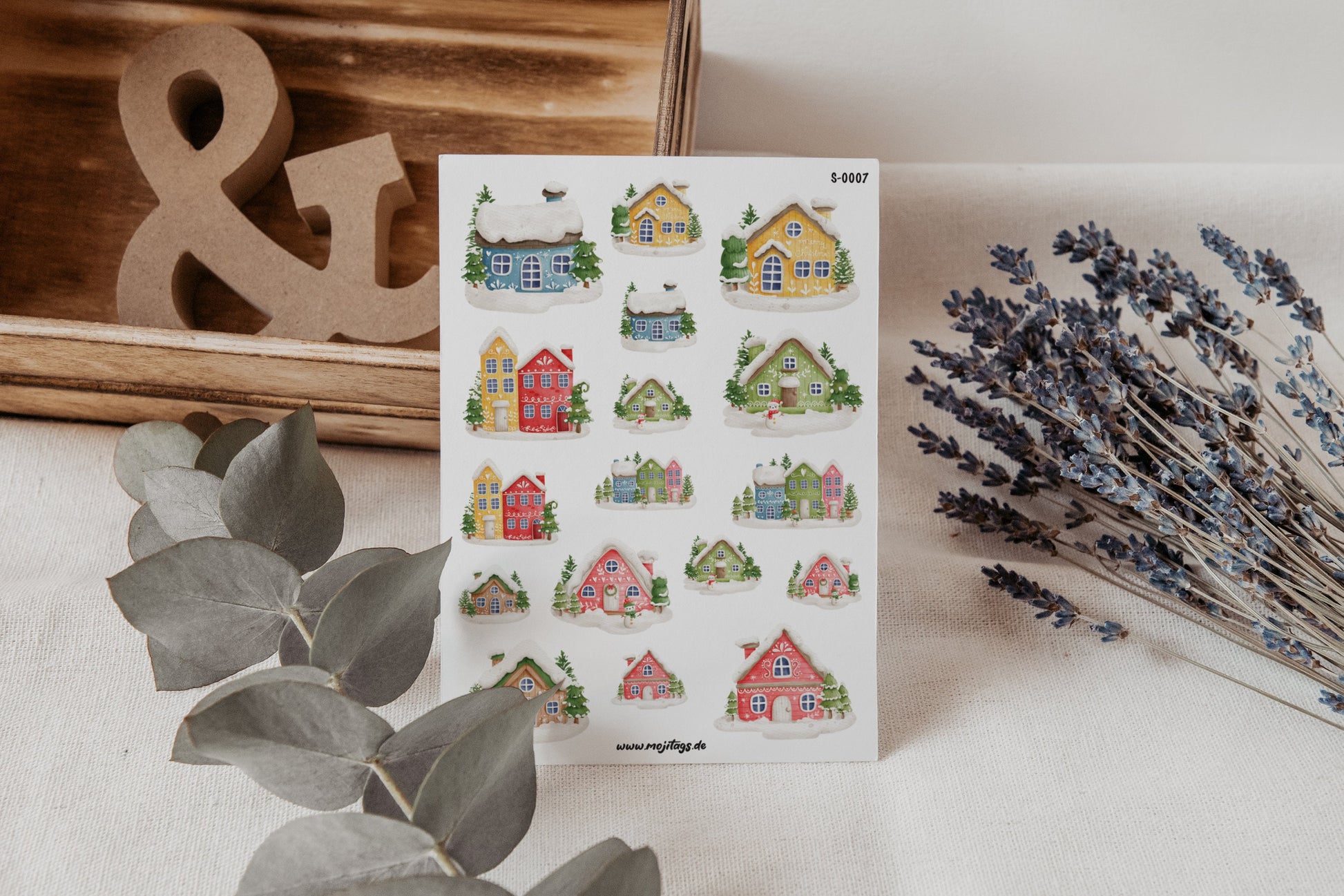 Tauche ein in eine zauberhafte Winterwelt – mit diesen handgemachten Stickern verschneiter Häuschen bringst du Gemütlichkeit auf jede Seite!