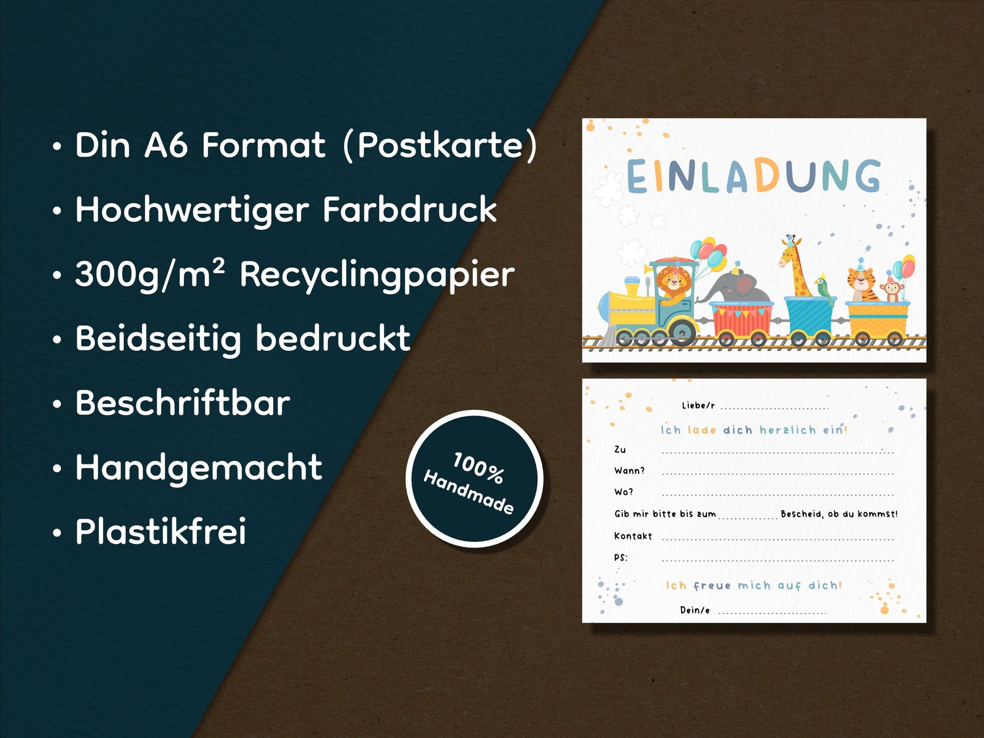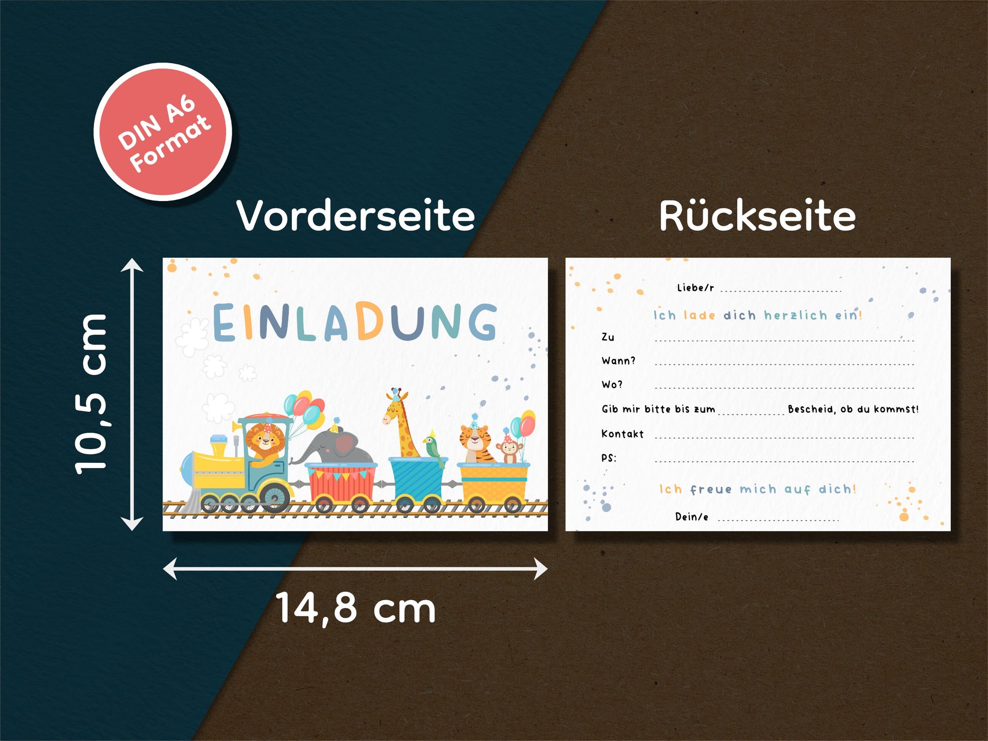 🎈 Alle einsteigen – der Geburtstagszug fährt ab! Diese liebevoll gestaltete Einladung bringt tierisch gute Laune auf deine Party. Im Zug sitzen Löwe, Giraffe, Elefant, Tiger und Affe – alle bereit zum Feiern!
